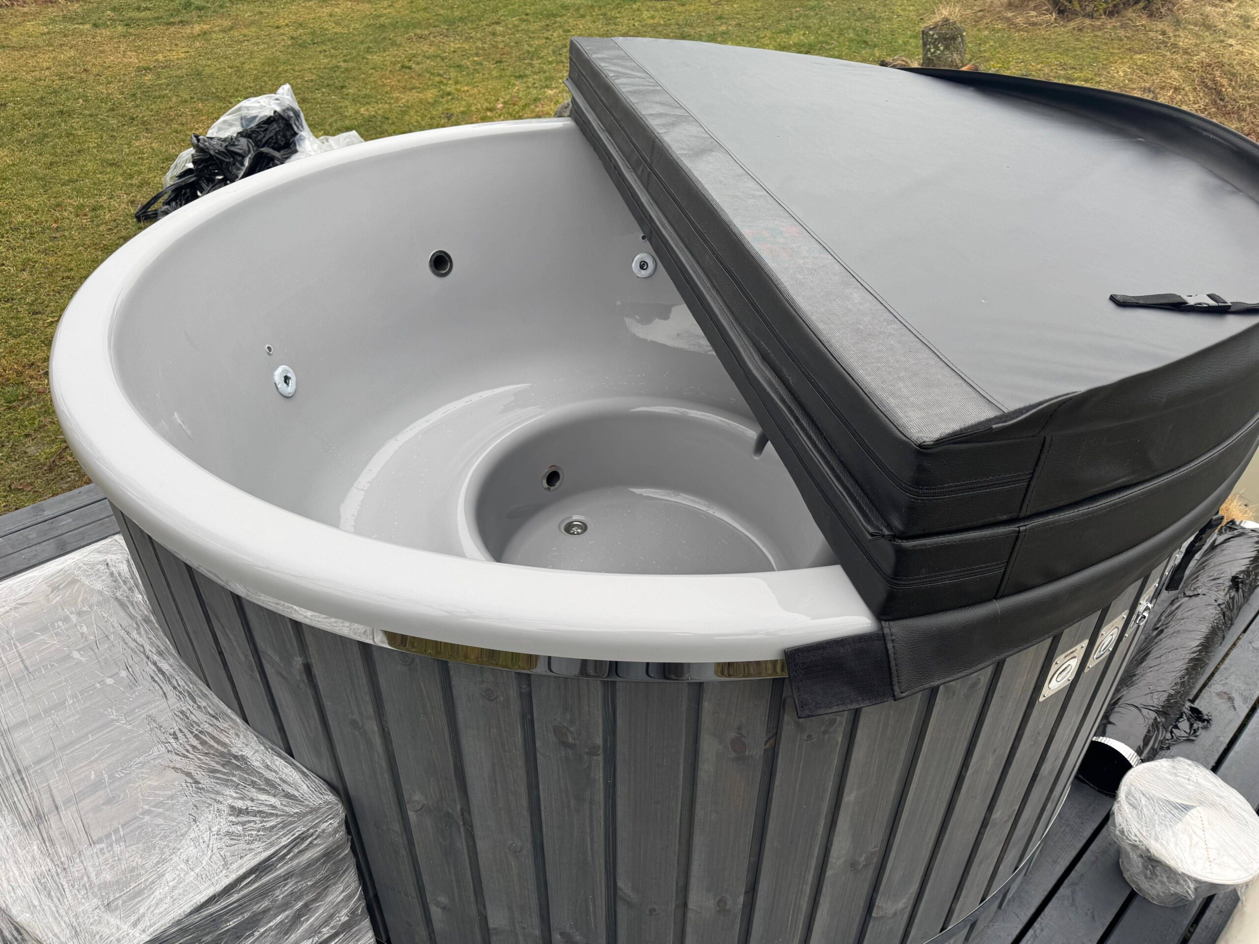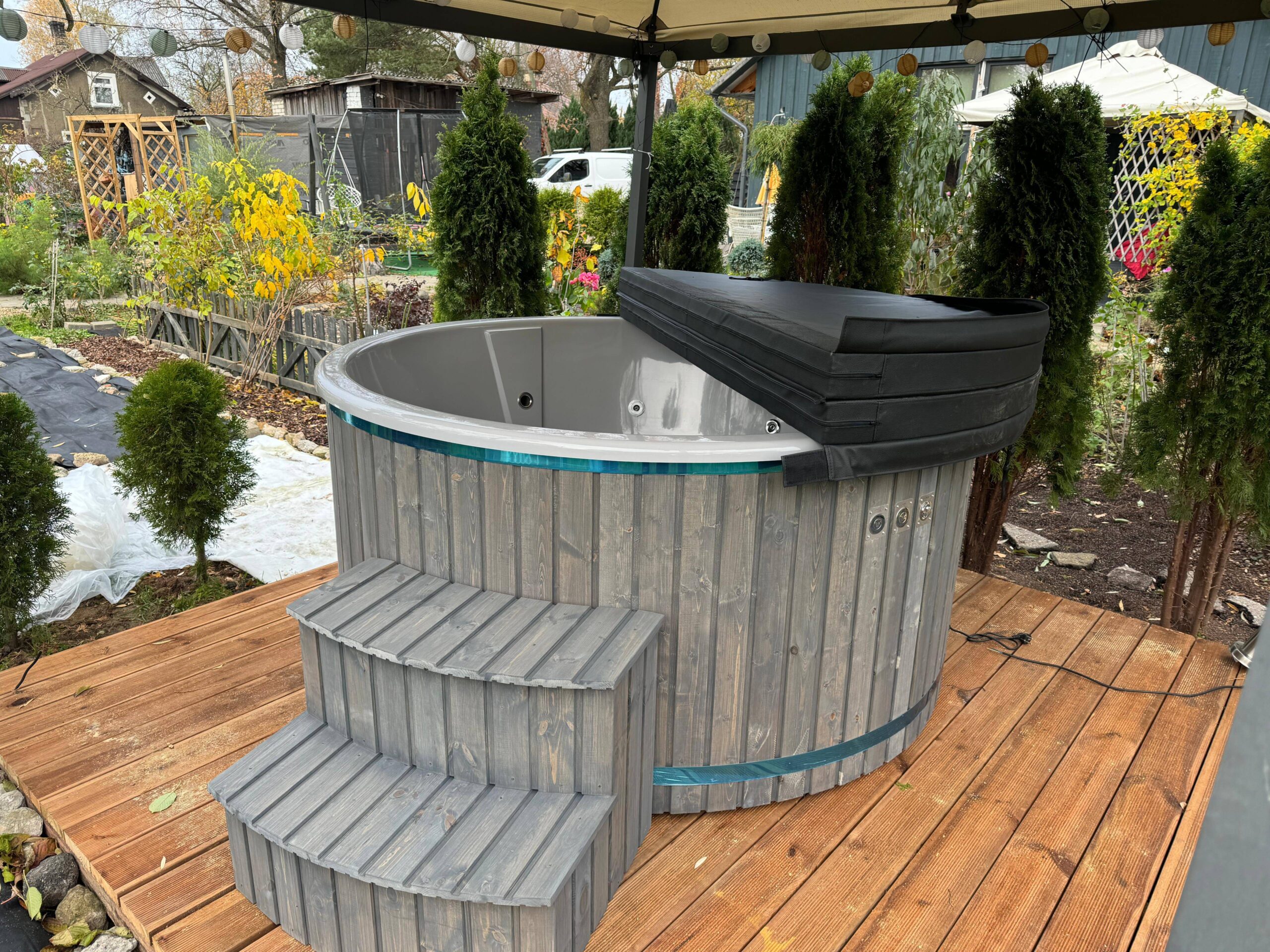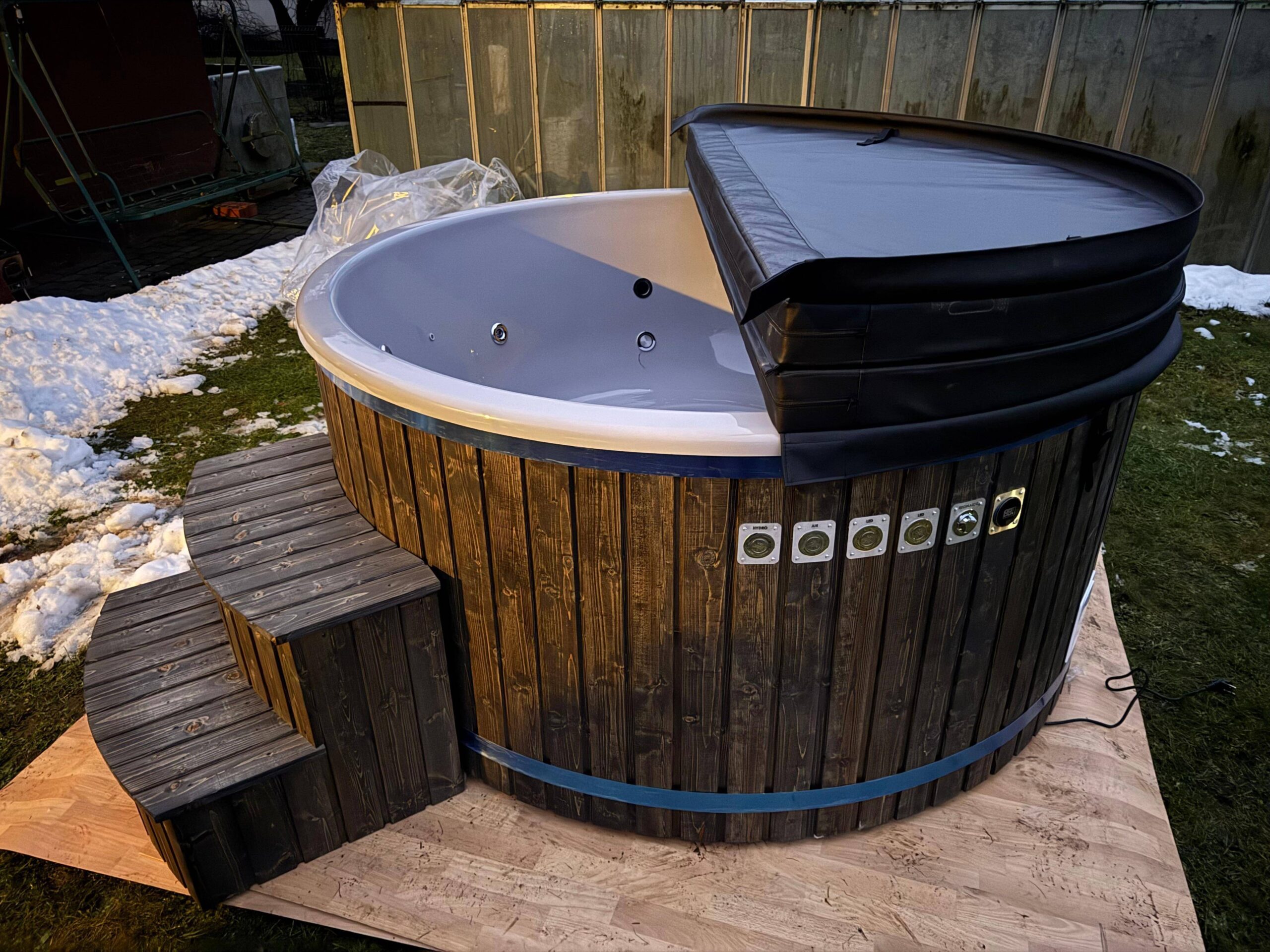Unsere Hot Tubs sind standardmäßig mit einer zusätzlichen Thermoisolierung der Wanne ausgestattet, sowie mit einem Thermodeckel aus Kunstleder, sodass die Wassertemperatur besser und länger gehalten werden kann.