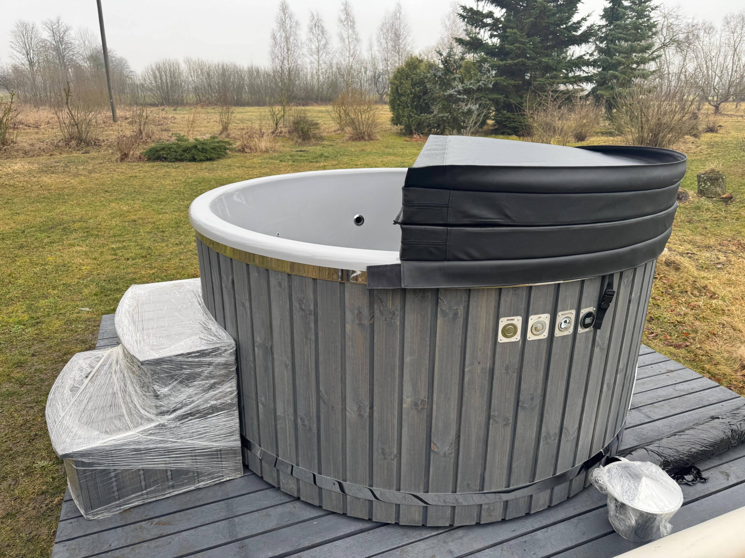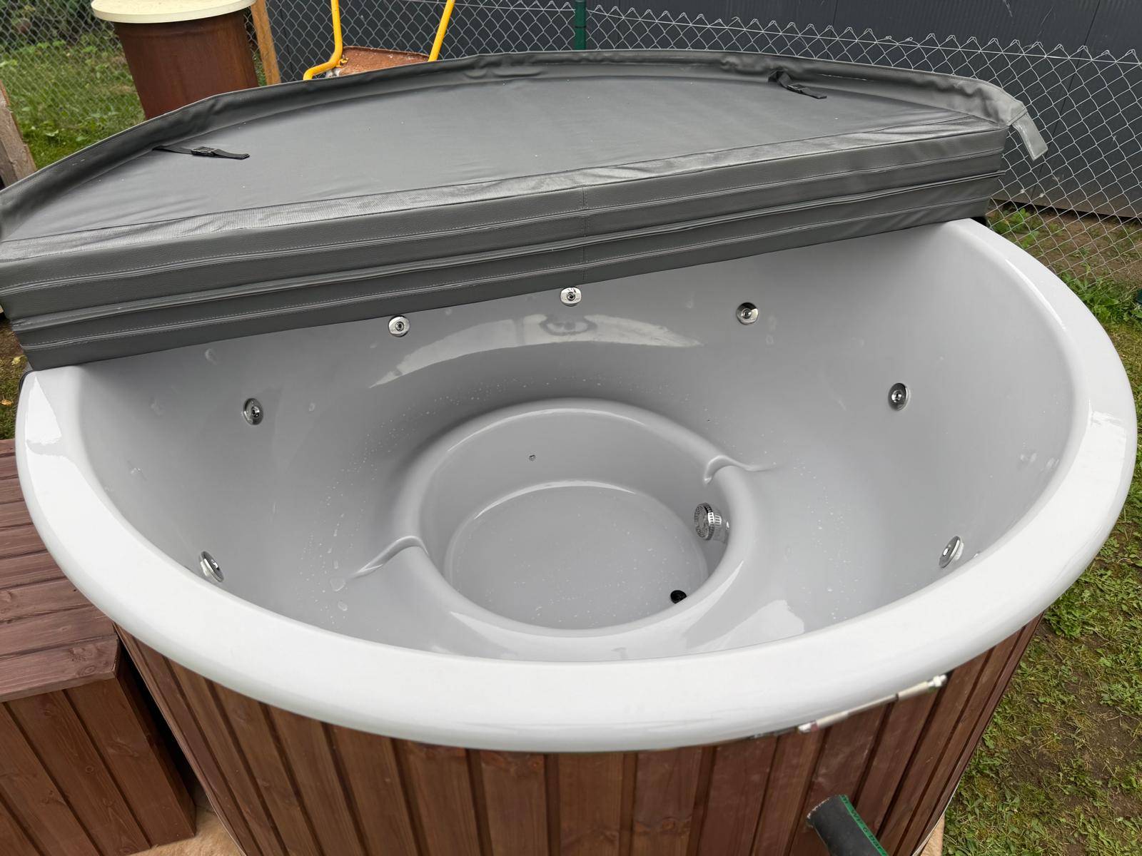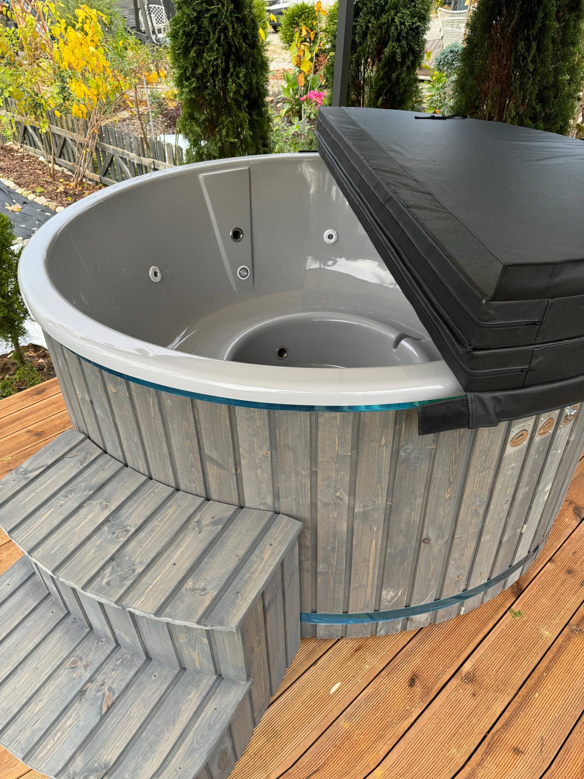 Unsere Hot Tubs sind standardmäßig mit einer zusätzlichen Thermoisolierung der Wanne ausgestattet, sowie mit einem Thermodeckel aus Kunstleder, sodass die Wassertemperatur besser und länger gehalten werden kann.