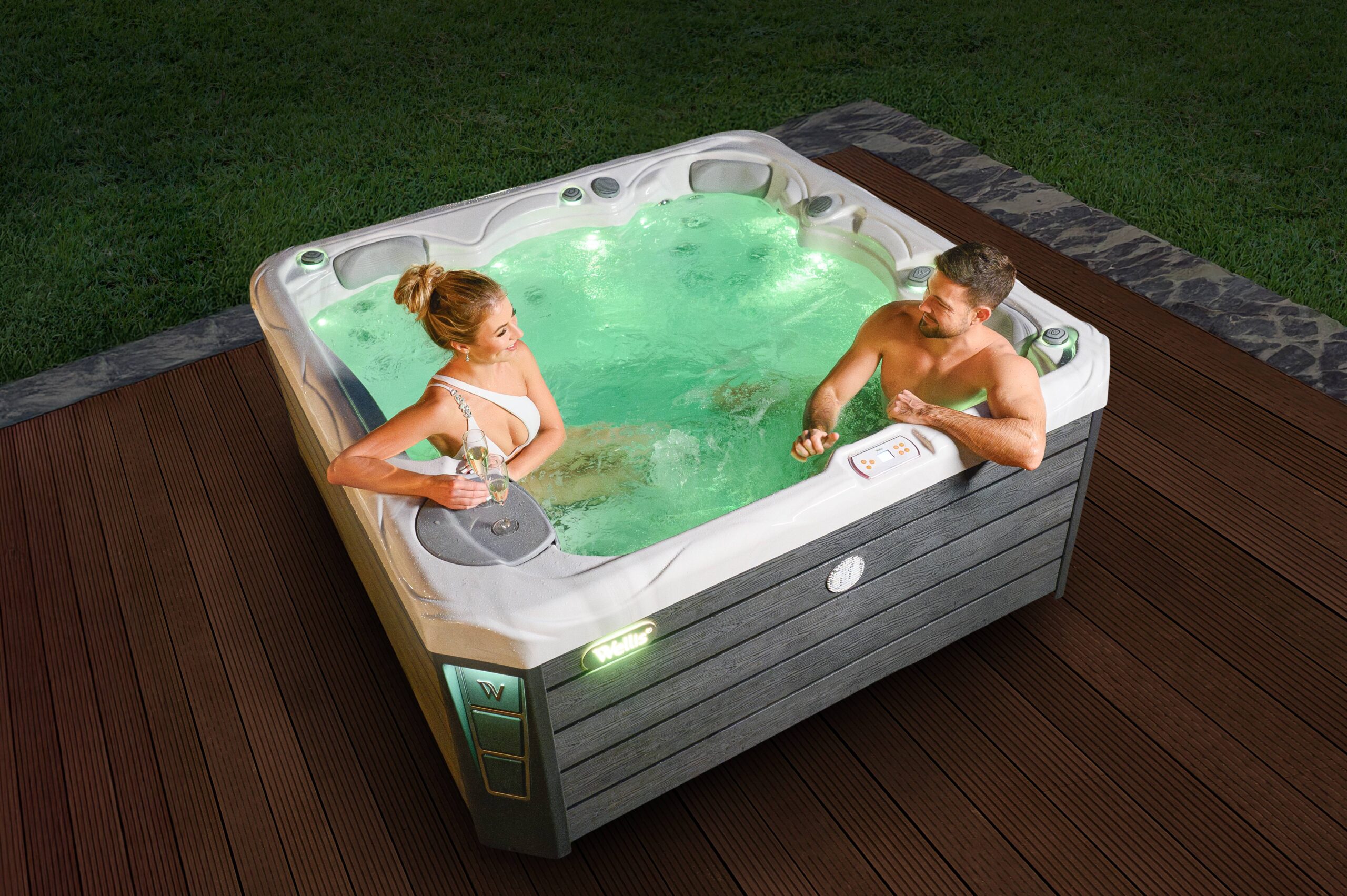 Exklusive Spot- und stimmungsvolle Randbeleuchtung verwandeln deinen Whirlpool am Abend in eine elegante Outdoor-Wellnesszone.