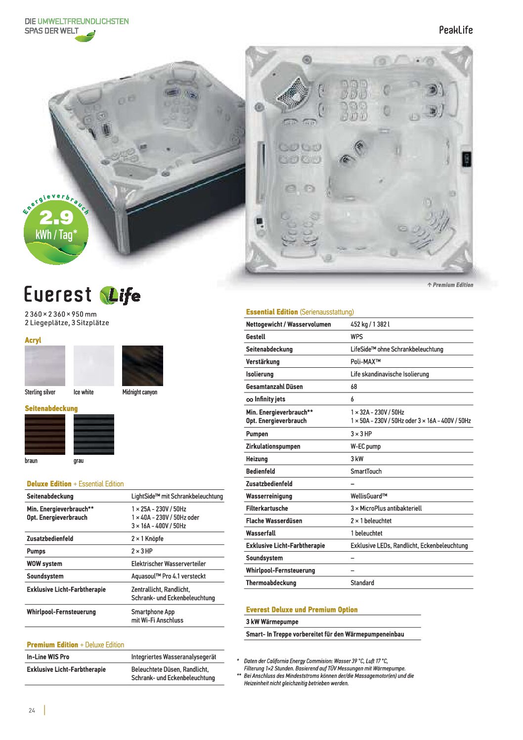 Der Everest Life wird in 3 Ausstattungsformen, Essential Edition, Deluxe Edition und Premium Edition angeboten. Die Essential Edition stellt die Serienausstattung dar. Die Deluxe Edition baut auf der Essential Edition auf und weist Zusätze, u.a. elektrischer Wasserverteiler, Whirlpool-Fernsteuerung durch Smartphone App und Soundsystem aus. Die Premium Edition stellt die höchste Ausstattungsform des Everest Life dar mit zusätzlichen beleuchteten Düsen und integriertem Wasseranalysegerät.